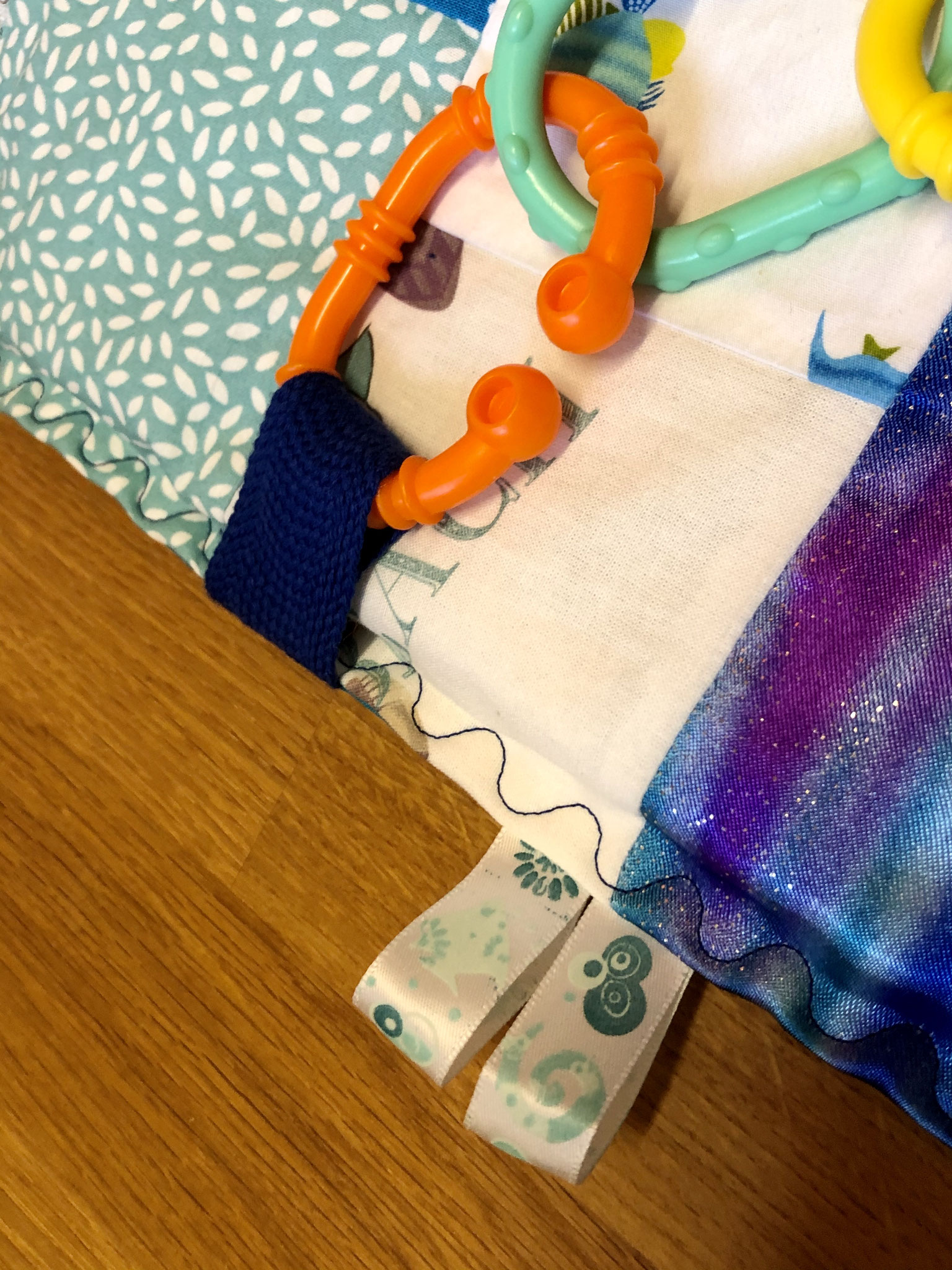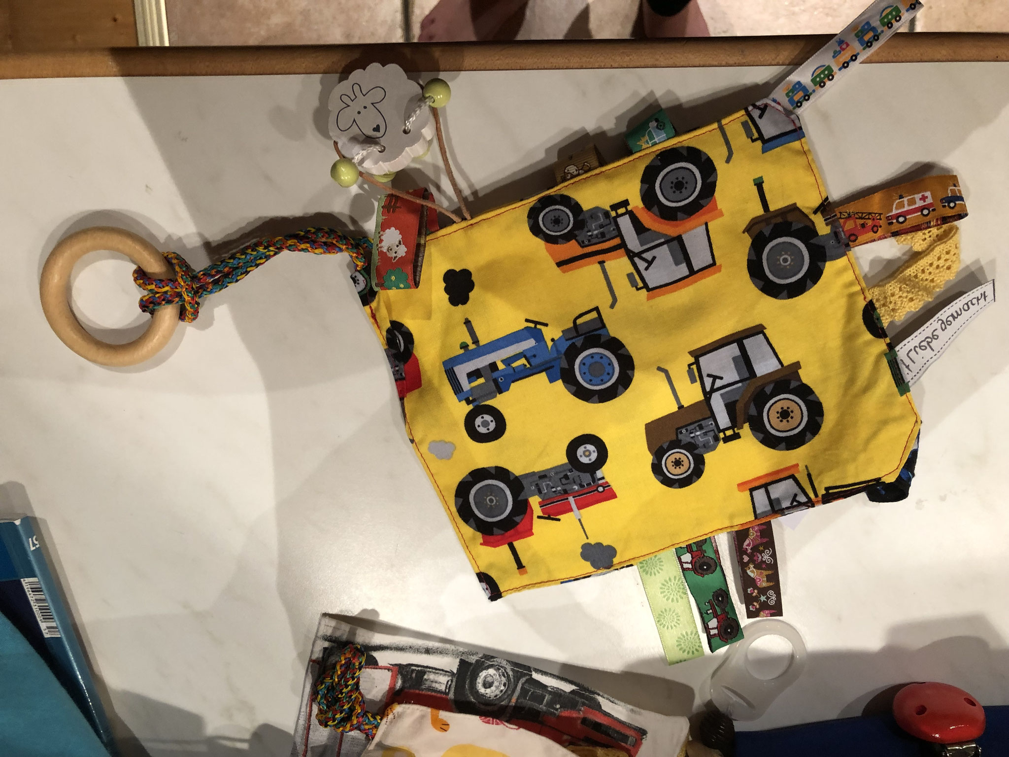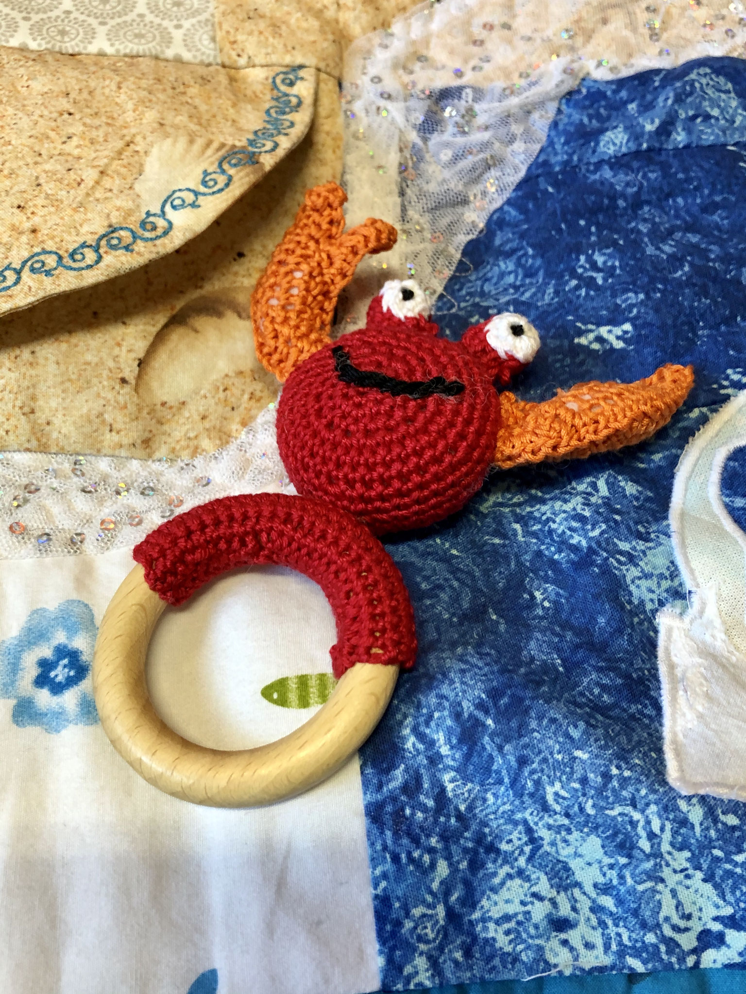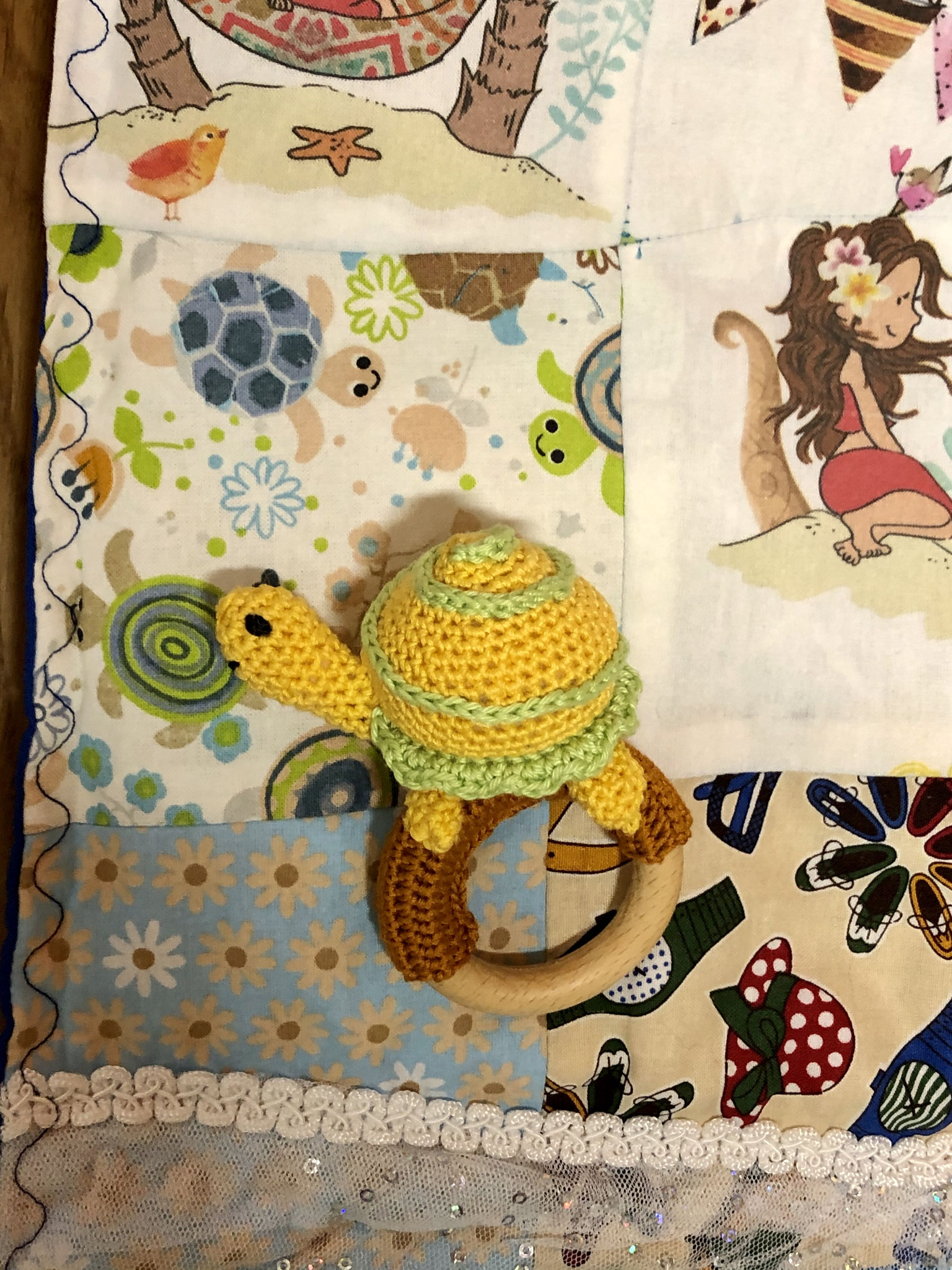 Bei diesen Krabbeldecken gibt es viel zu entdecken. Als Zubehör werden gehäkelte Rasselis, Beiss- und Steckringe, Stofftiere und Spielketten