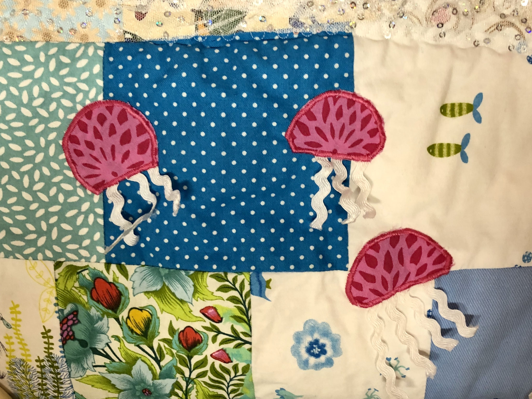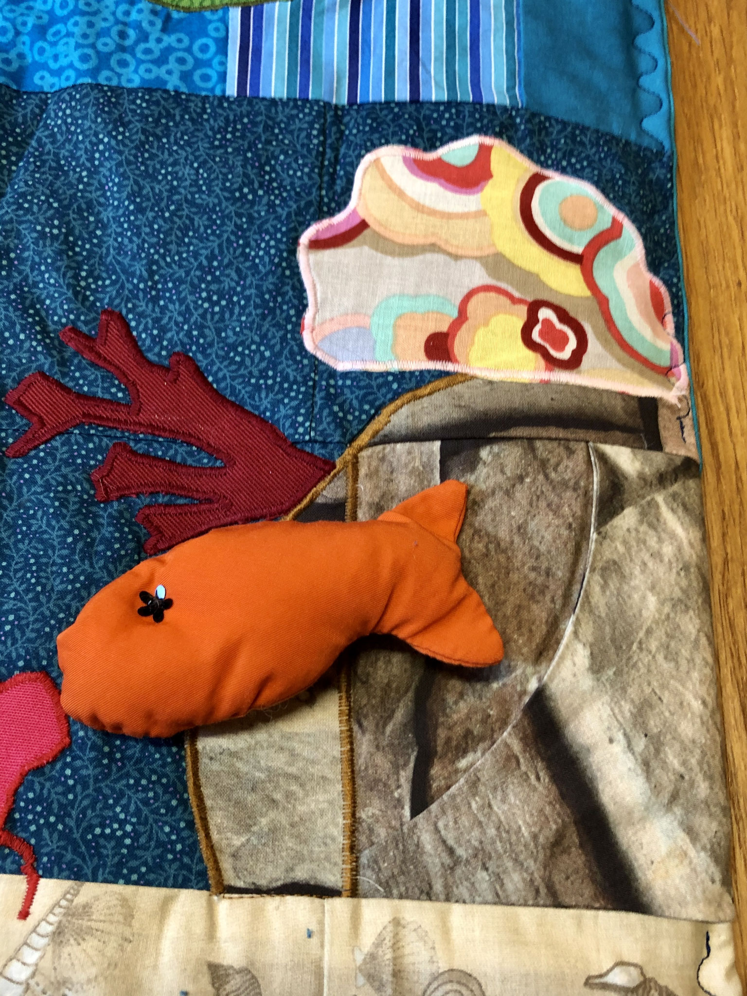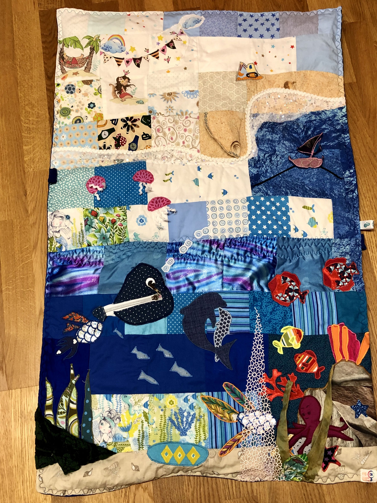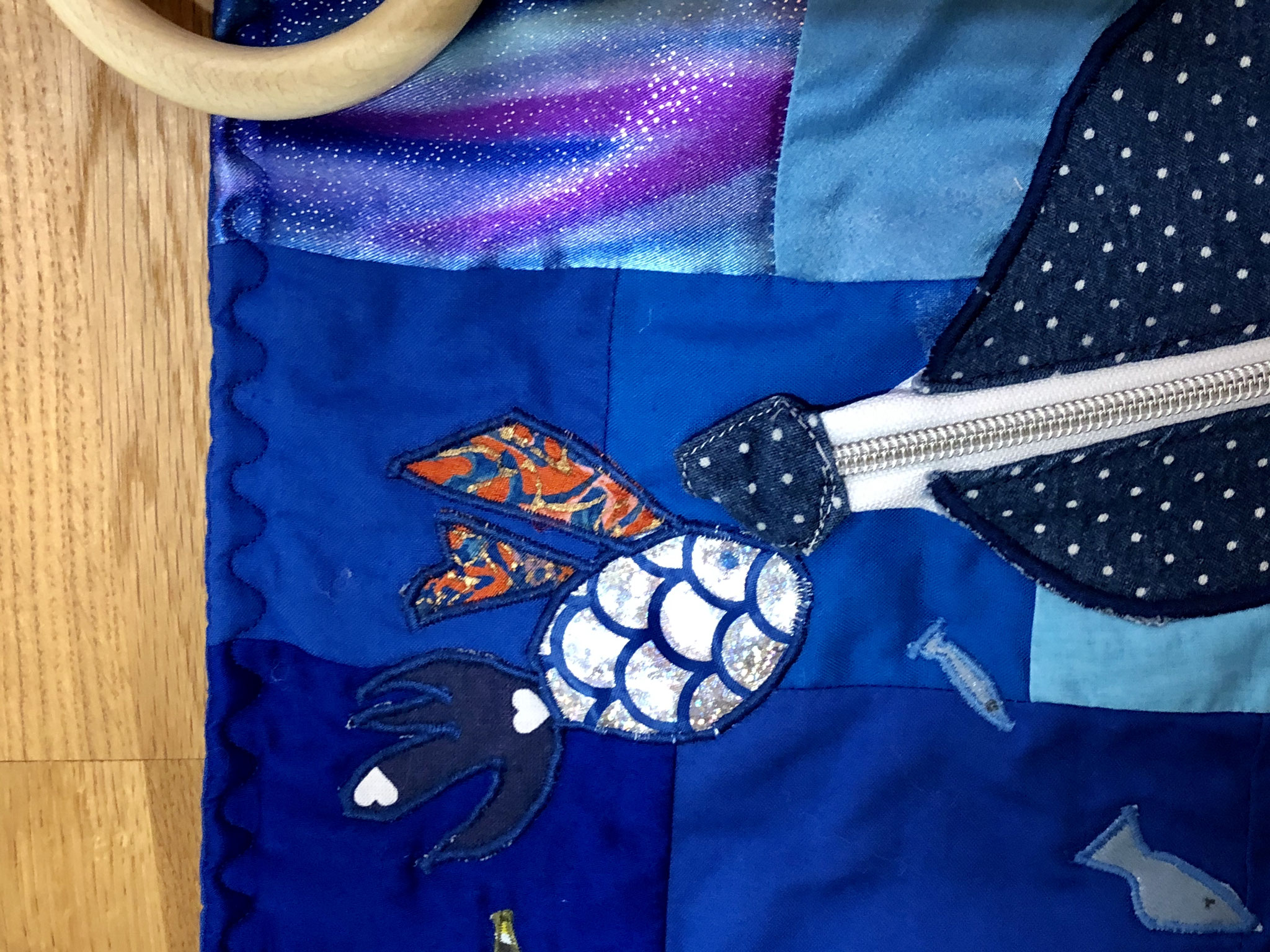 mitgeliefert. In der Vorderseite der Decke sind verschiedene Höhlen und Öffnungen eingearbeitet, wo man Fische und den Krebs verstecken kann. Die Höhle des Krebses ist mit einer Knisterfolie gefüttert, so dass sie knistert, wenn man sie drückt und berührt. Die Tentakel der Quallen sind fühl- und greifbar. Manche Stoffe glitzern, besonders wenn Licht oder die Sonne darauf scheint.
