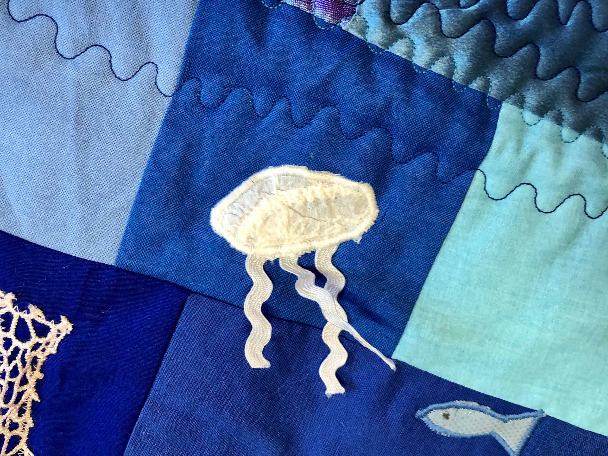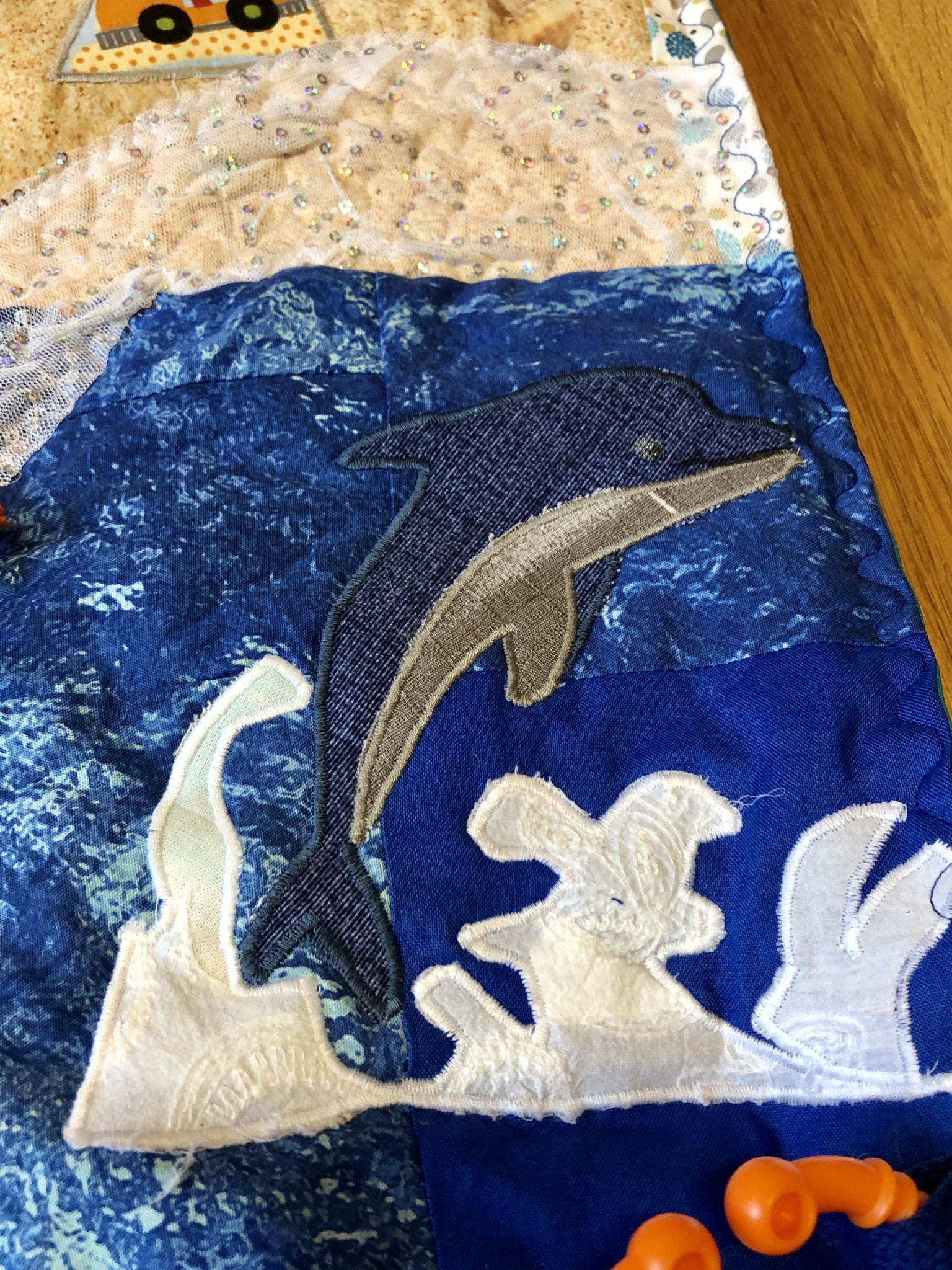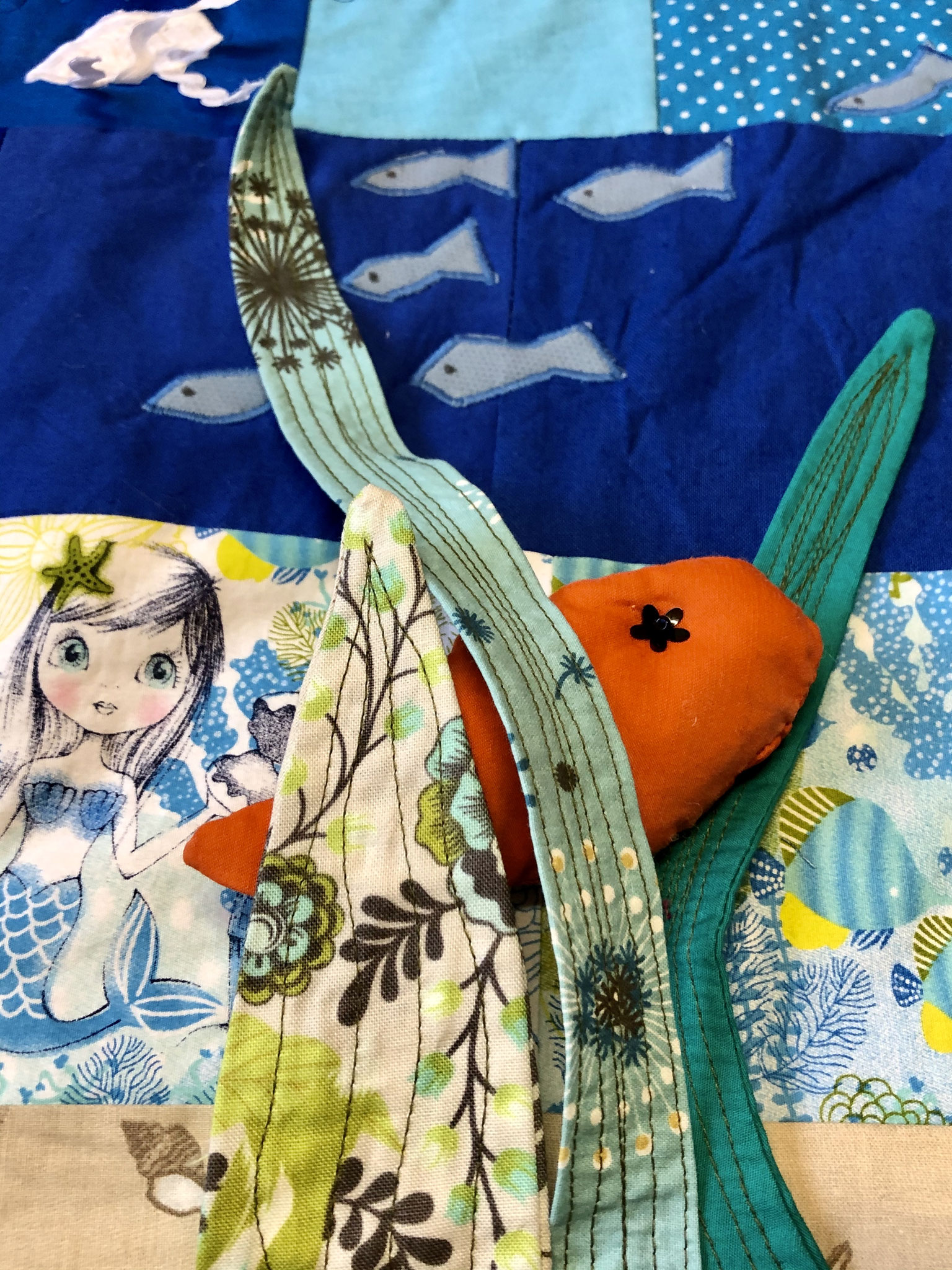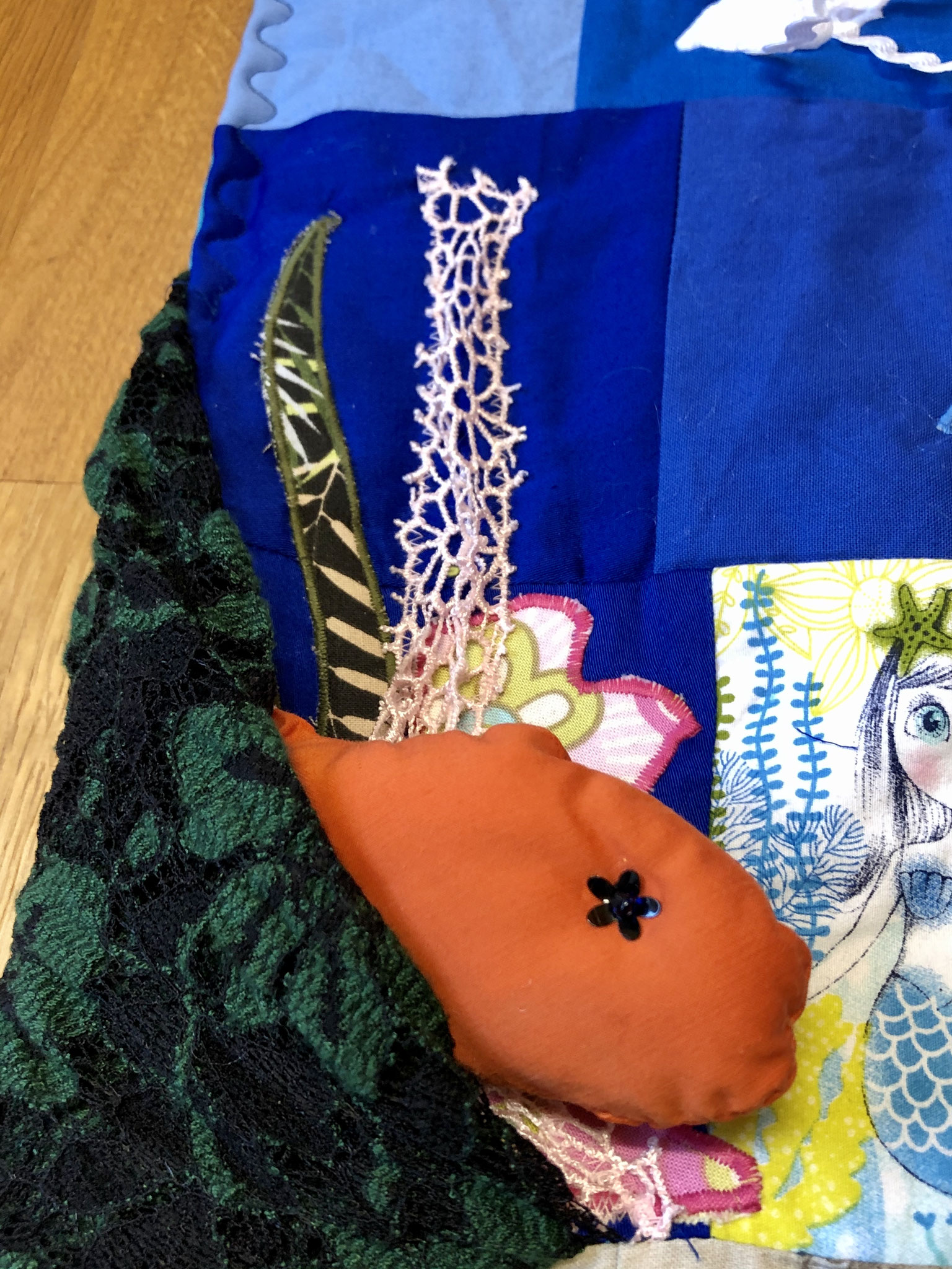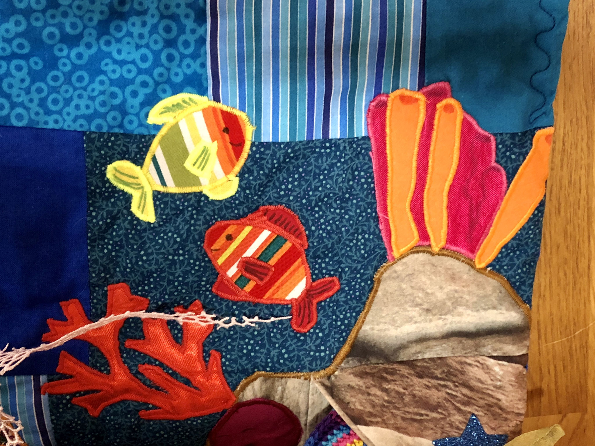 mitgeliefert. In der Vorderseite der Decke sind verschiedene Höhlen und Öffnungen eingearbeitet, wo man Fische und den Krebs verstecken kann. Die Höhle des Krebses ist mit einer Knisterfolie gefüttert, so dass sie knistert, wenn man sie drückt und berührt. Die Tentakel der Quallen sind fühl- und greifbar. Manche Stoffe glitzern, besonders wenn Licht oder die Sonne darauf scheint.