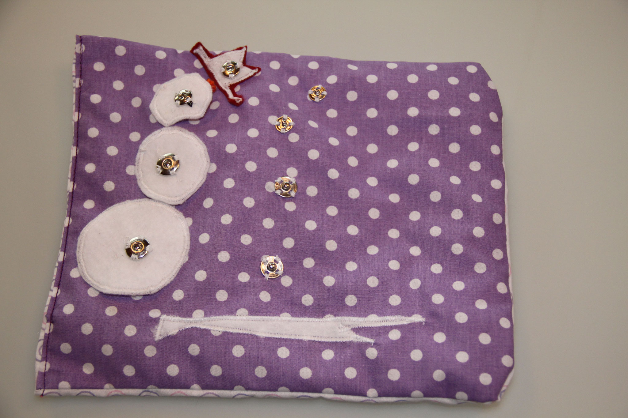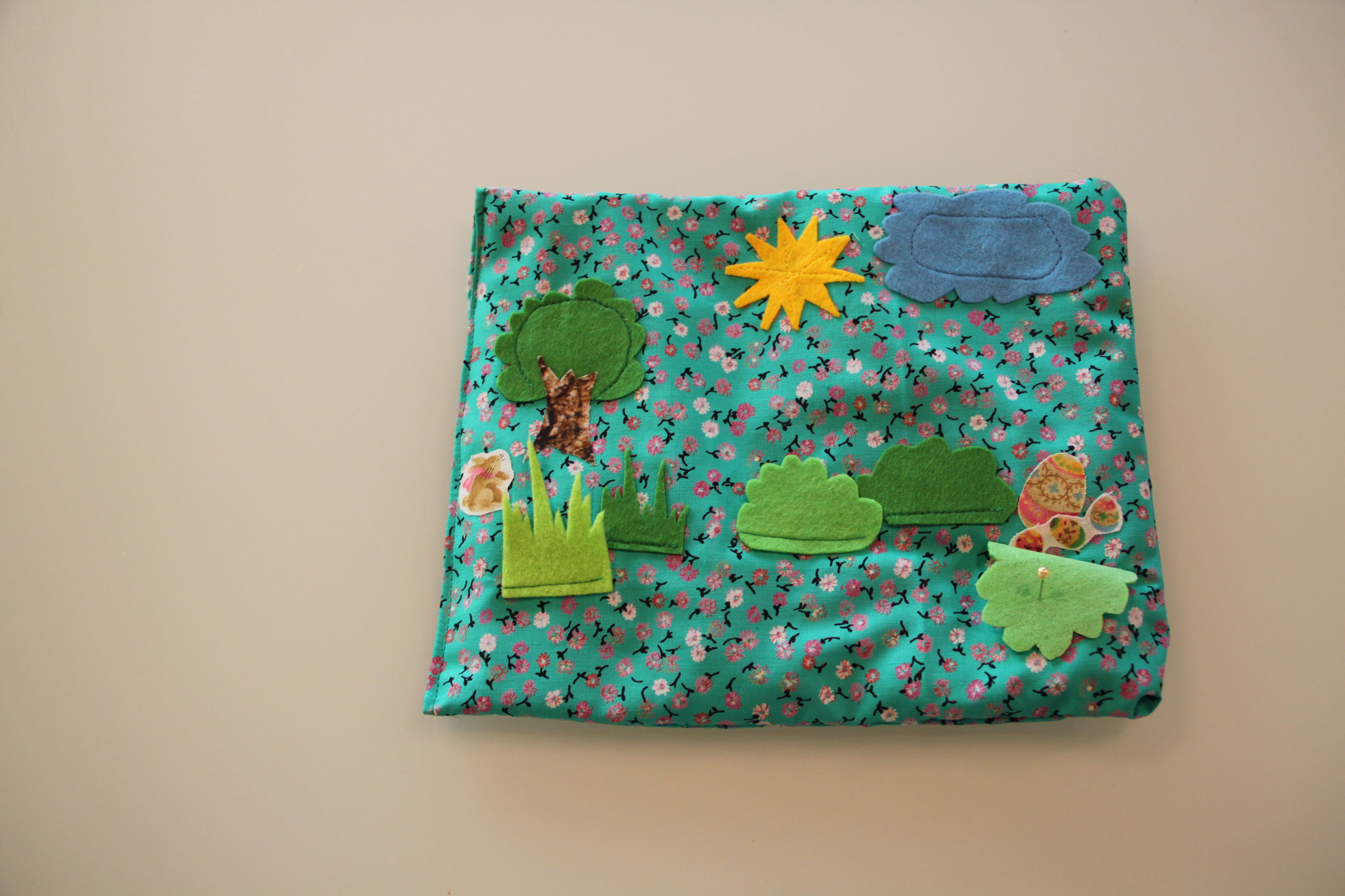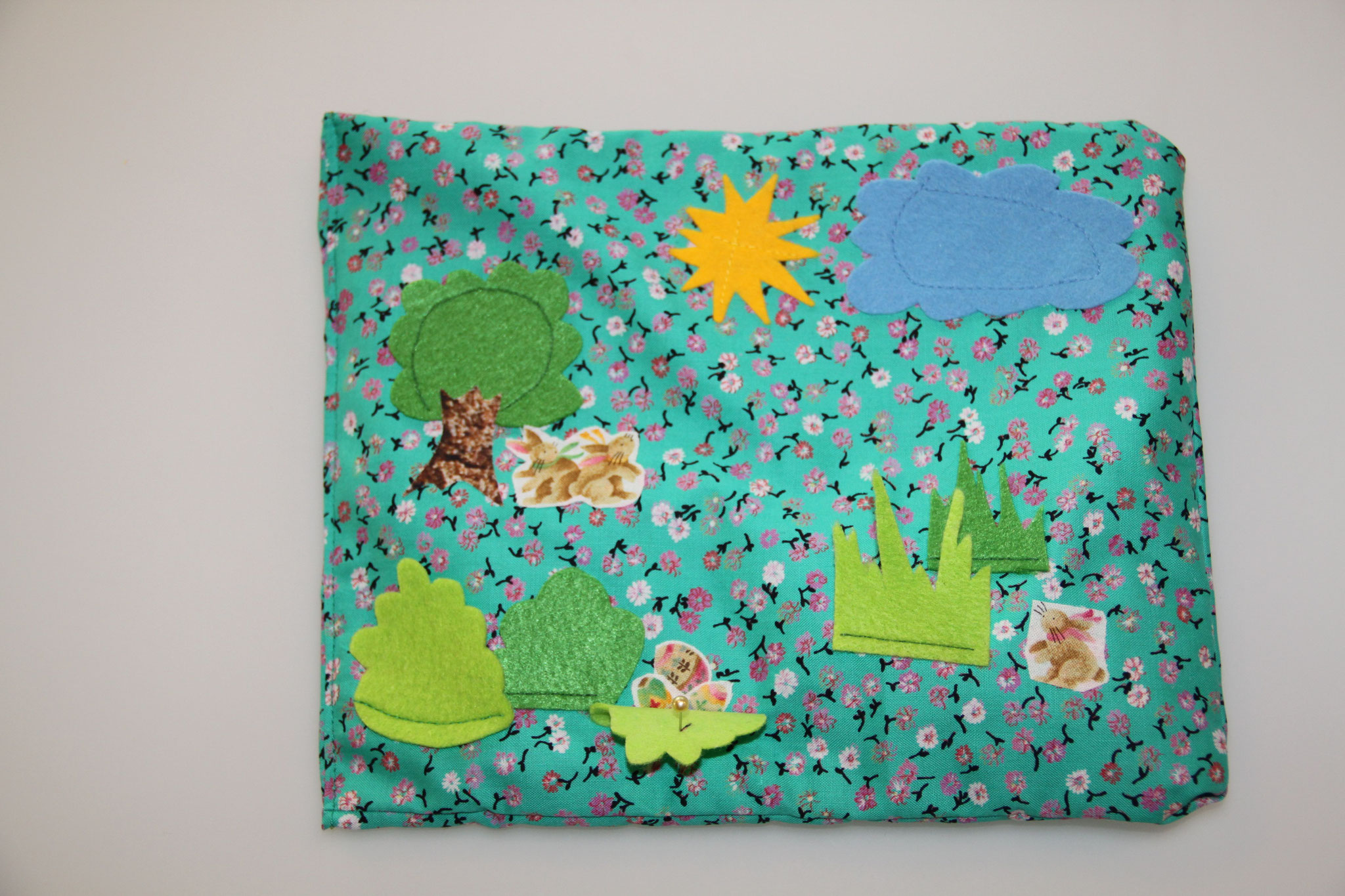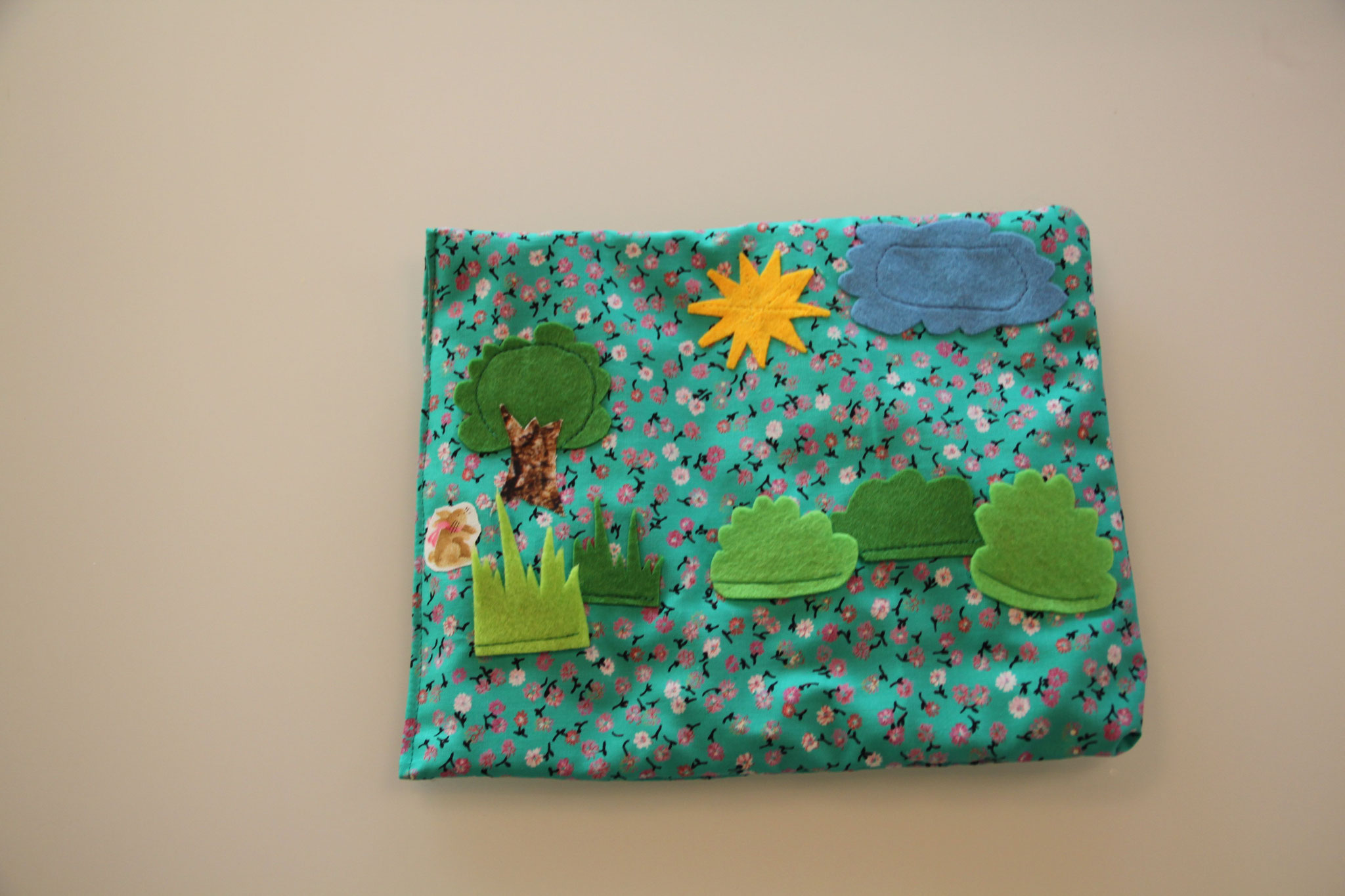 mitgeliefert. In der Vorderseite der Decke sind verschiedene Höhlen und Öffnungen eingearbeitet, wo man Fische und den Krebs verstecken kann. Die Höhle des Krebses ist mit einer Knisterfolie gefüttert, so dass sie knistert, wenn man sie drückt und berührt. Die Tentakel der Quallen sind fühl- und greifbar. Manche Stoffe glitzern, besonders wenn Licht oder die Sonne darauf scheint.