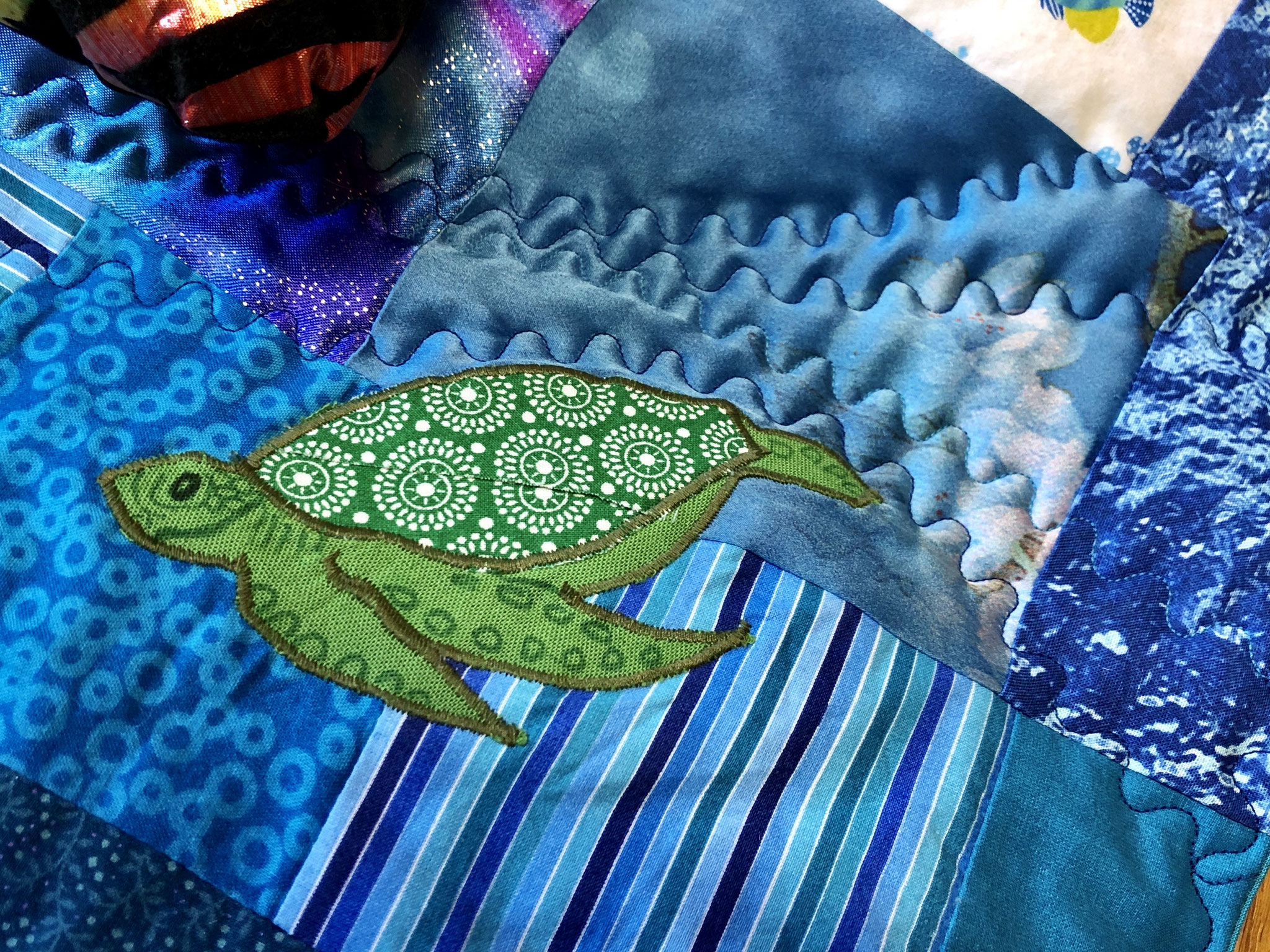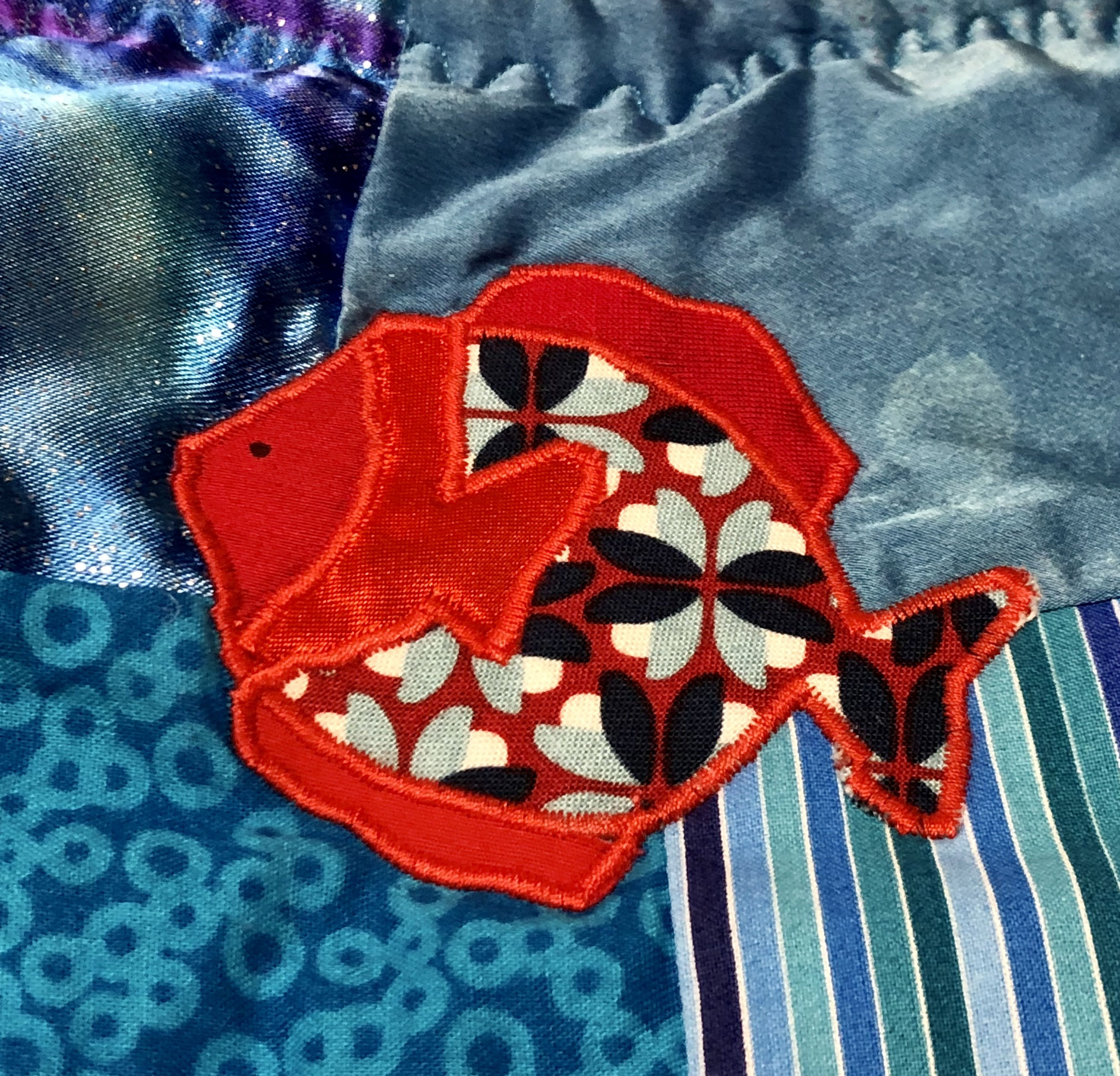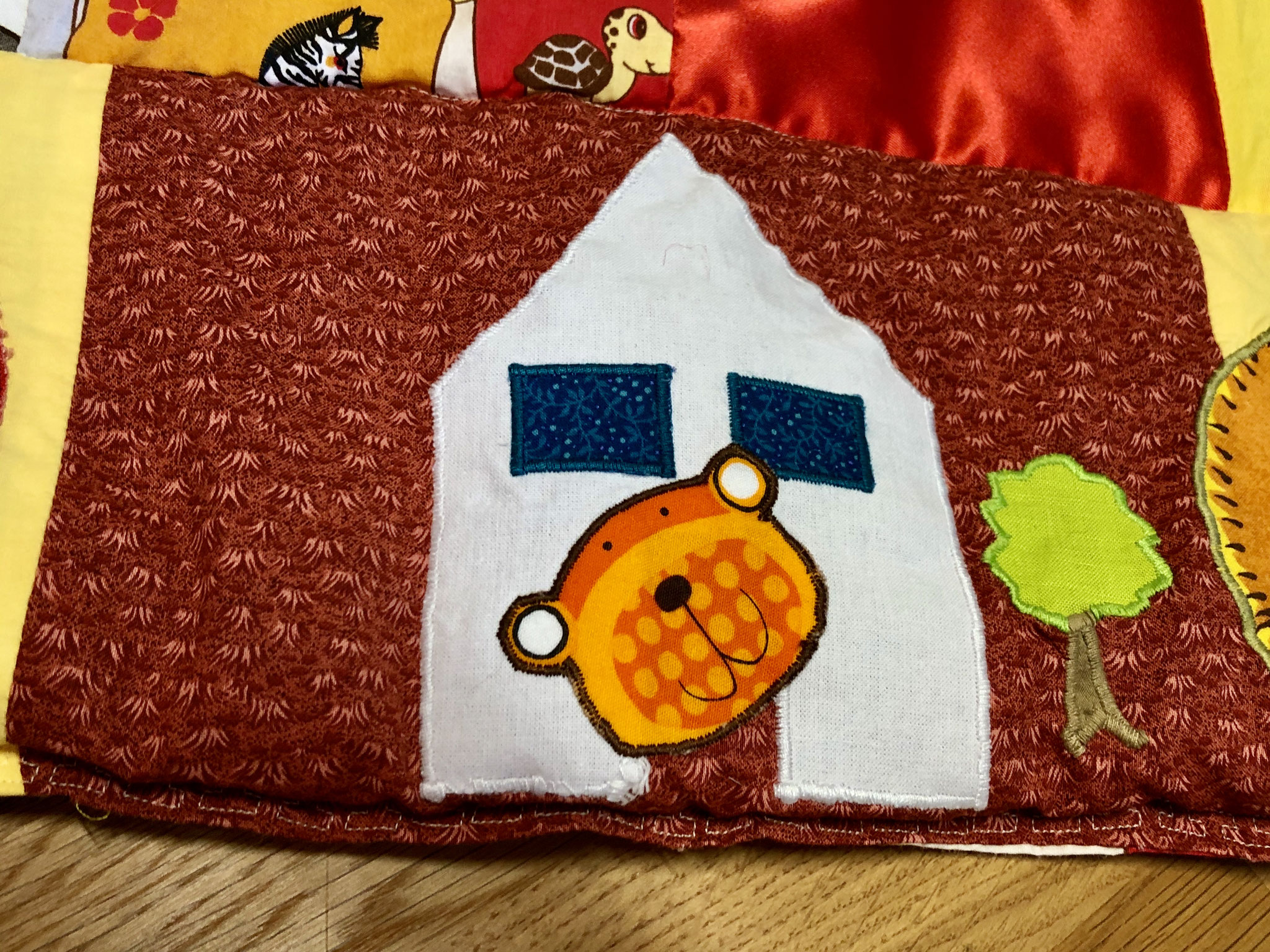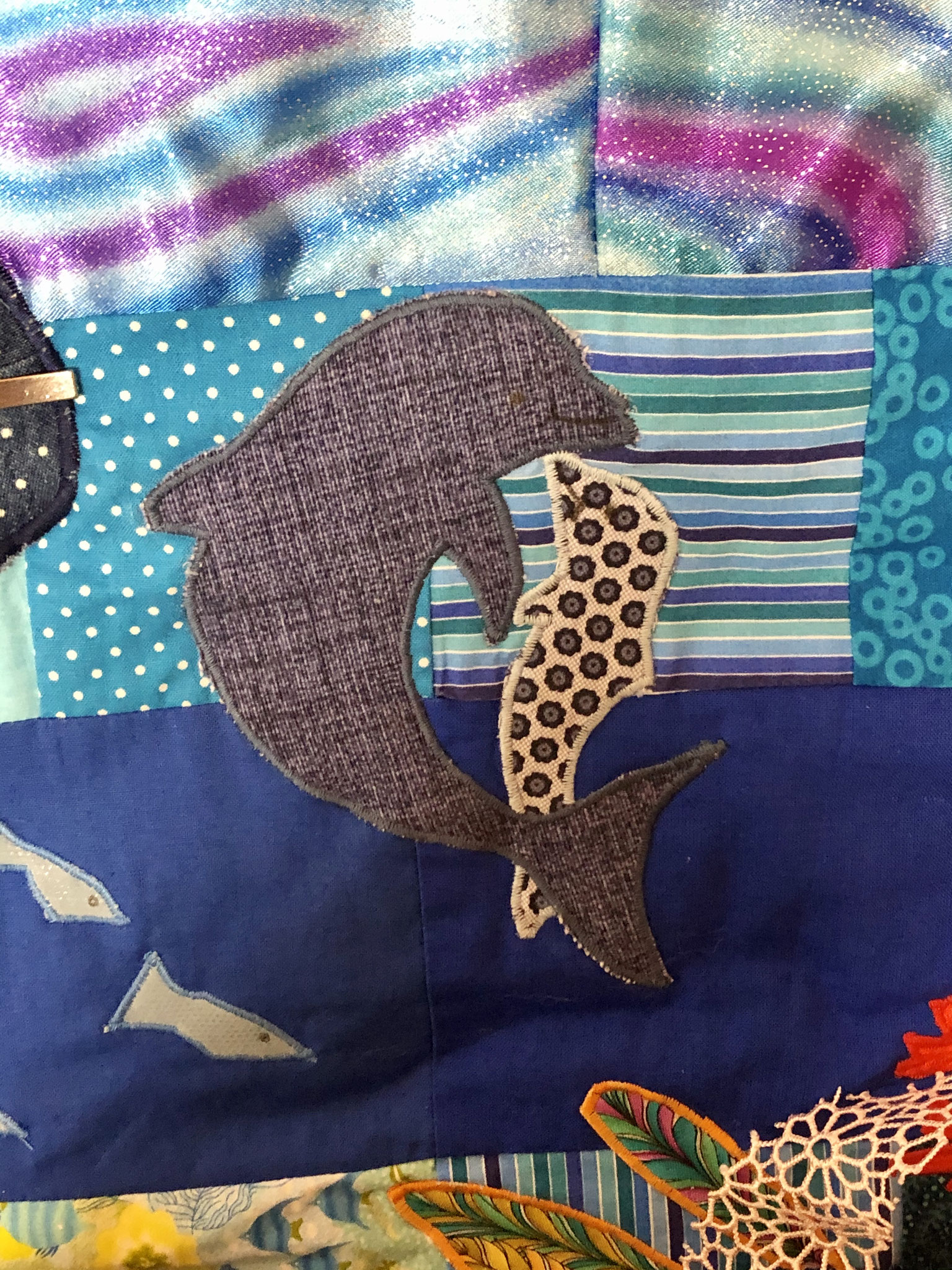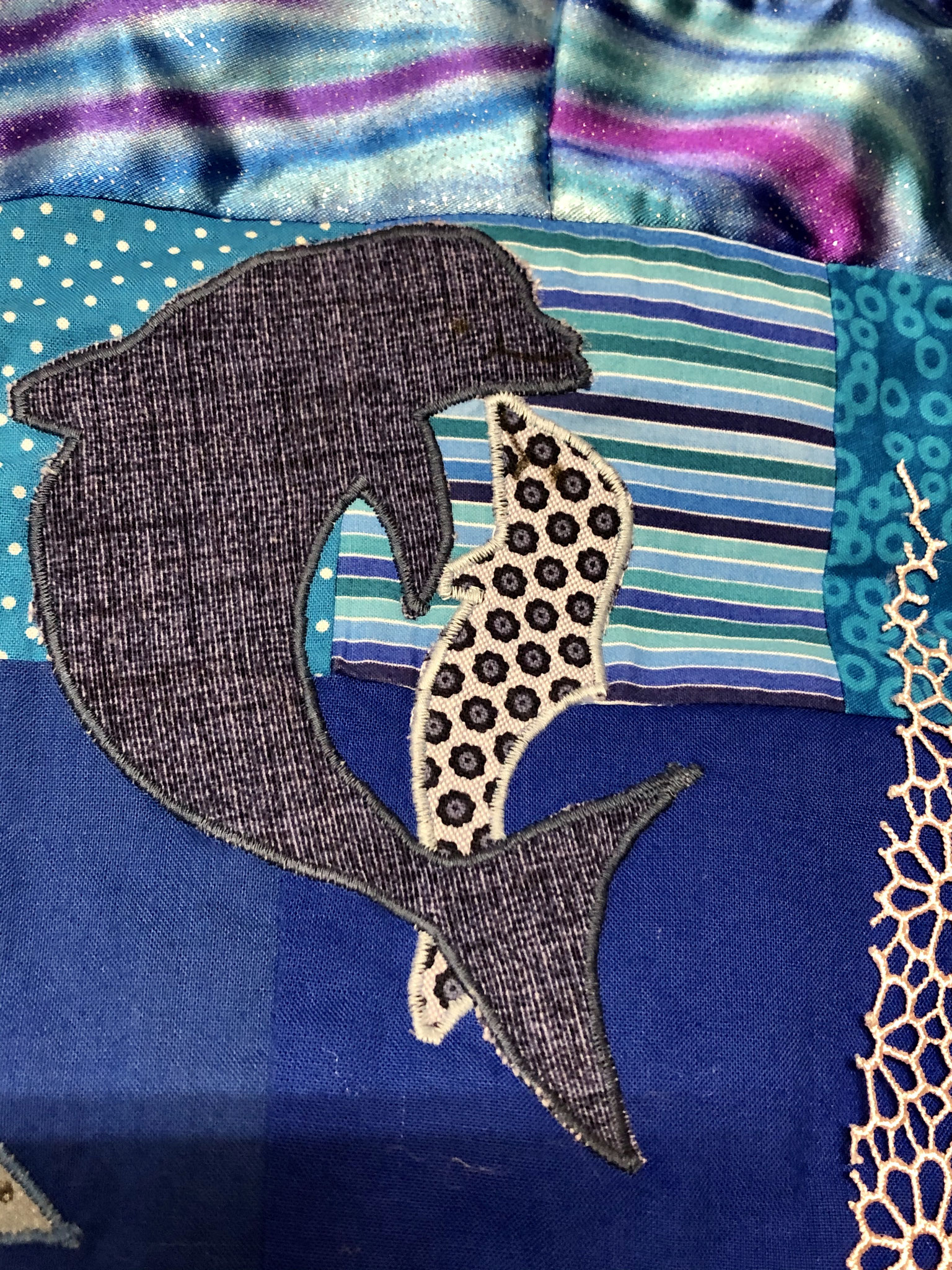 mitgeliefert. In der Vorderseite der Decke sind verschiedene Höhlen und Öffnungen eingearbeitet, wo man Fische und den Krebs verstecken kann. Die Höhle des Krebses ist mit einer Knisterfolie gefüttert, so dass sie knistert, wenn man sie drückt und berührt. Die Tentakel der Quallen sind fühl- und greifbar. Manche Stoffe glitzern, besonders wenn Licht oder die Sonne darauf scheint.
